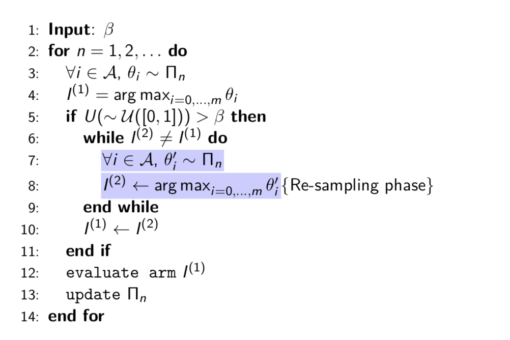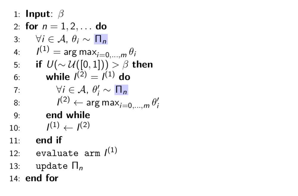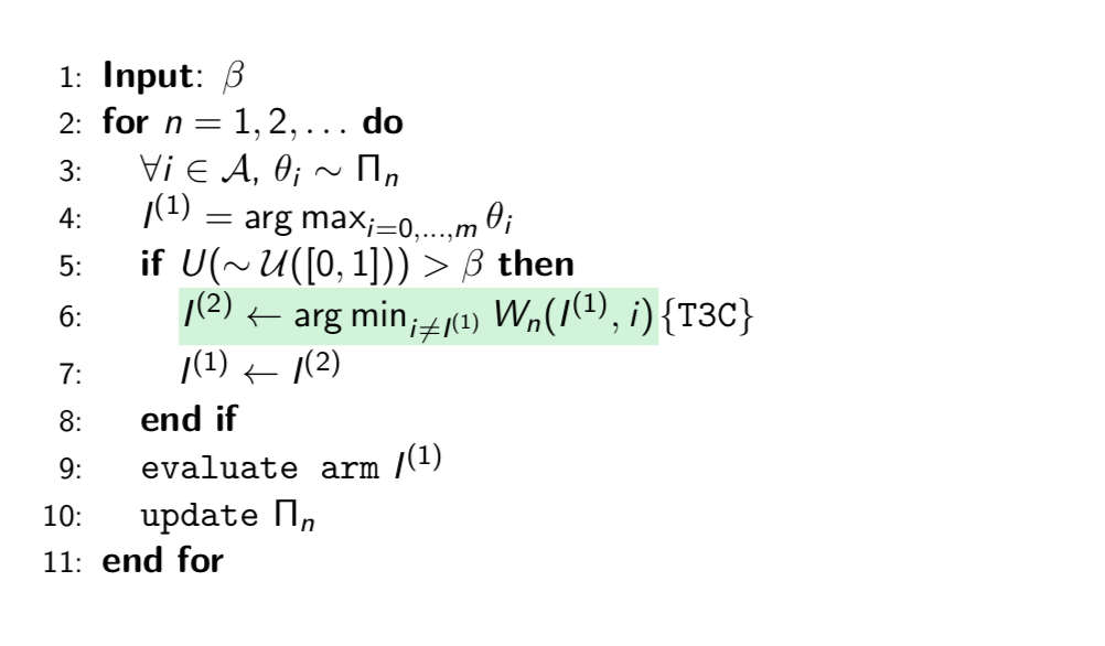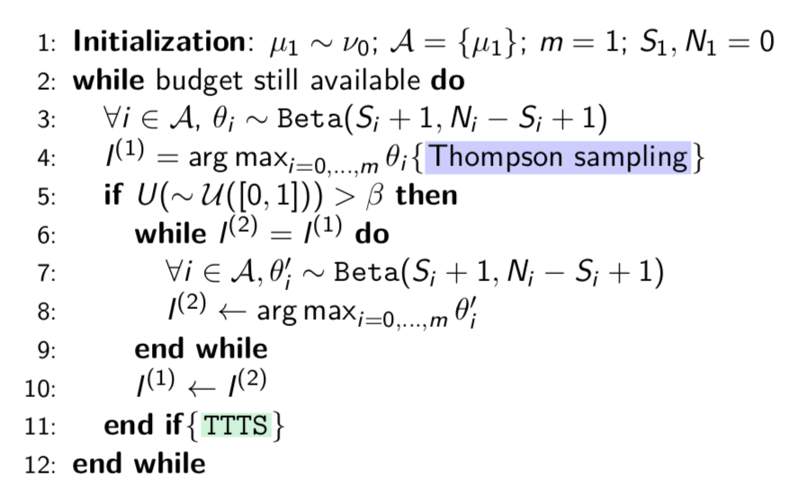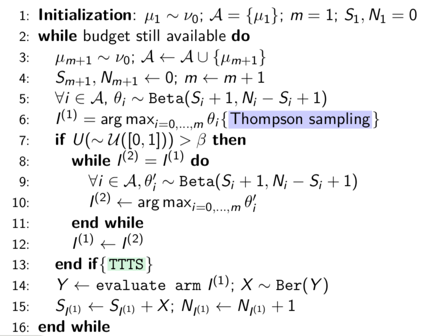 In summary: in each round, query a new arm endowed with a Beta(1,1) prior, without sampling it, and run TTTS on the new set of arms