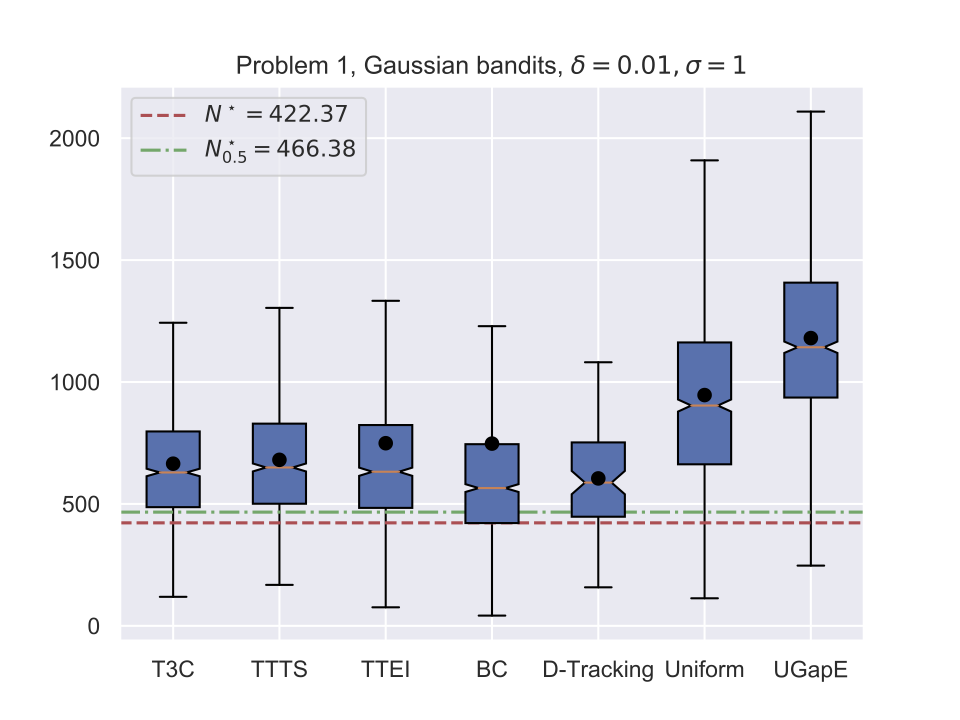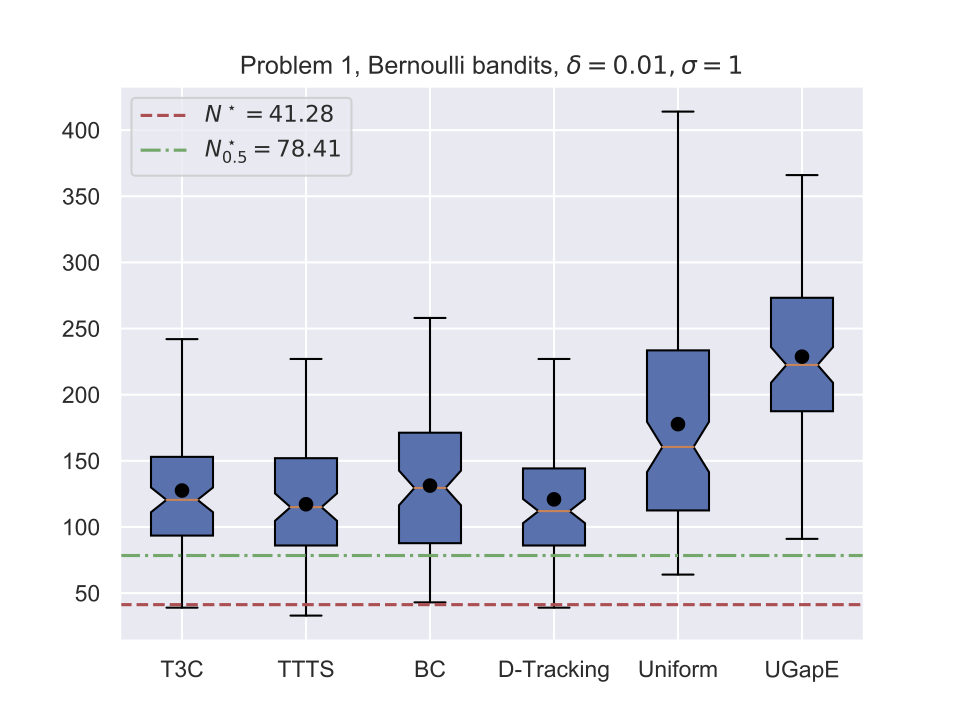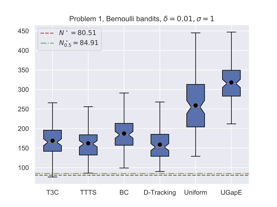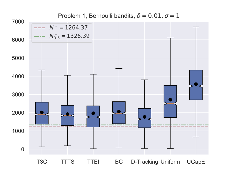 Theorem (Shang et al., 2020) The TTTS sampling rule coupled with the Chernoff stopping rule with a threshold $d_{n,\delta} \simeq \log(1/\delta) + c\log(\log(n))$ and the recommendation rule $J_t = \operatorname{arg\,max}_i \mu_{n,i}$, form a $\delta$-correct BAI strategy.